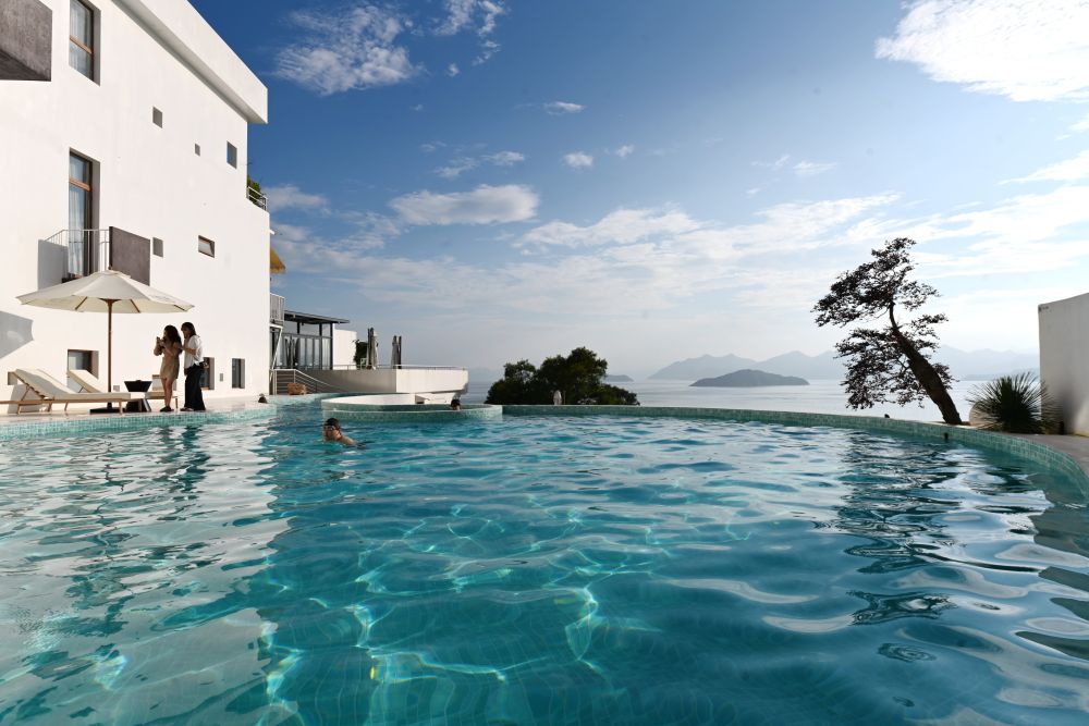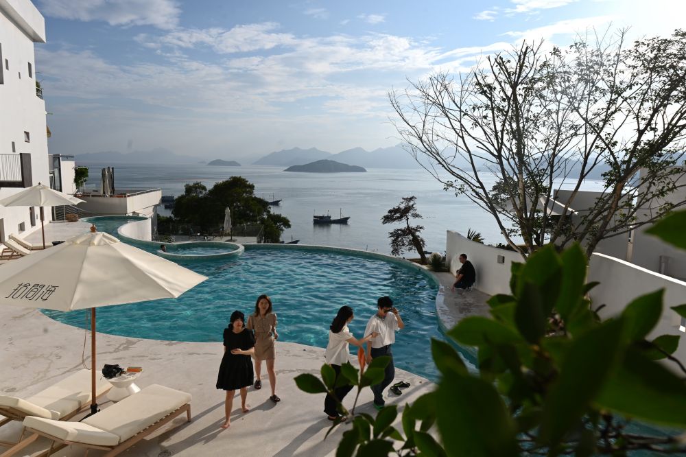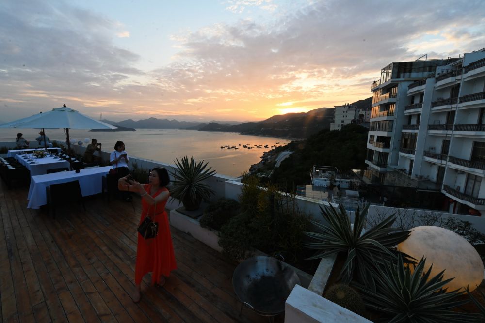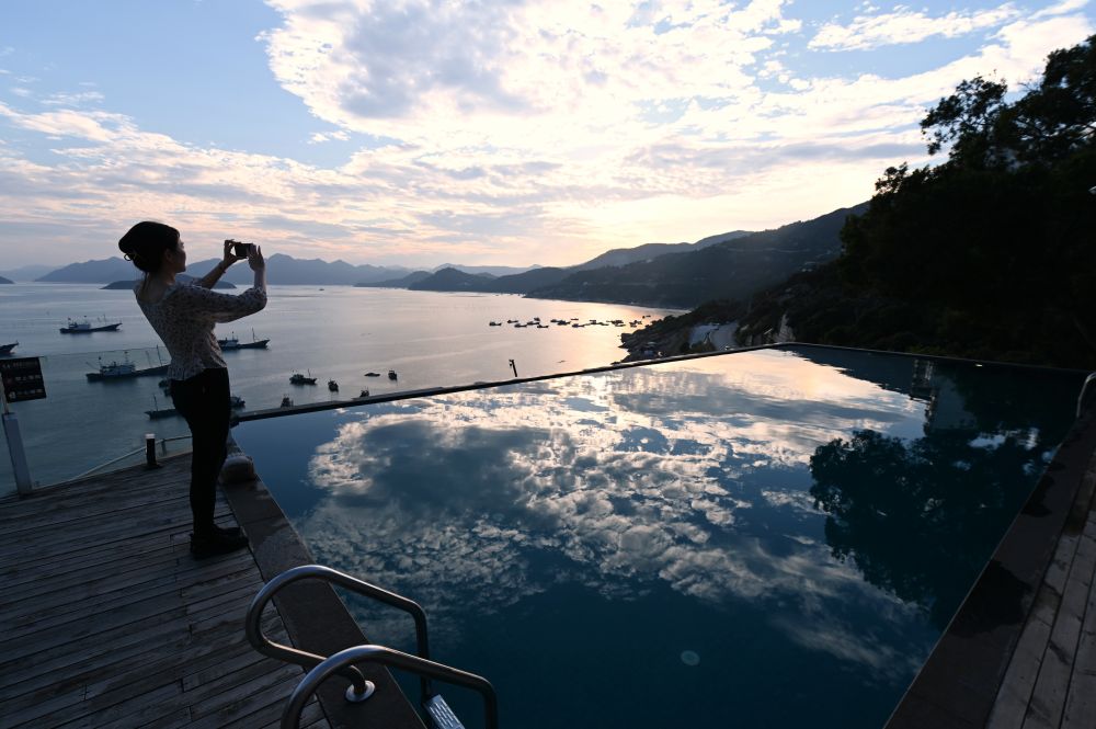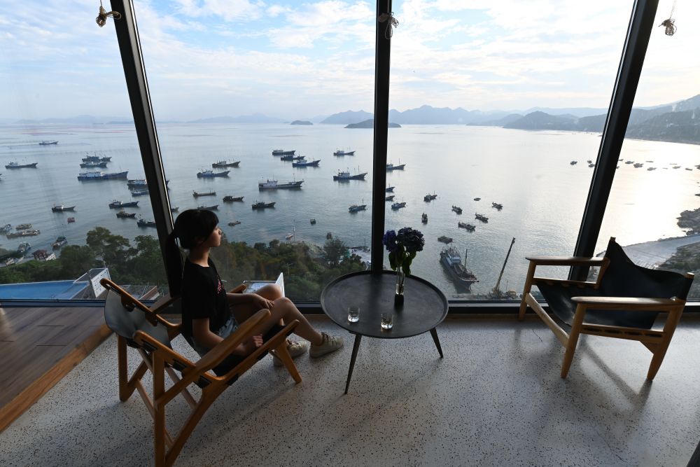 ↑6月22日,游客在霞浦县三沙镇东壁村的“拾间海”民宿观赏海景。