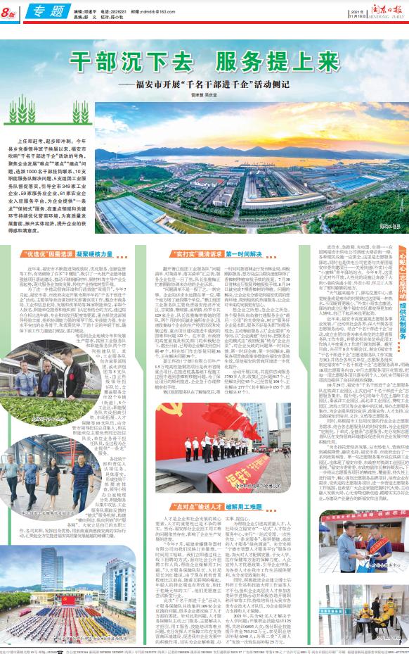 上任即赶考、起步即冲刺。今年县乡党委领导班子换届以来,福安市吹响“千名干部进千企”活动的号角,聚焦企业发展“难点”“堵点”“痛点”问题,选派1000名干部挂钩联系、10支职能服务队解决问题、5支组团工业服务队督促落实,引导全市349家工业企业、59家服务业企业、61家农业企业入驻服务平台,为企业提供“一条龙”“保姆式”服务,在重点领域和关键环节持续优化营商环境,为高质量发展蓄能,振兴实体经济,提升企业的获得感和满意度。