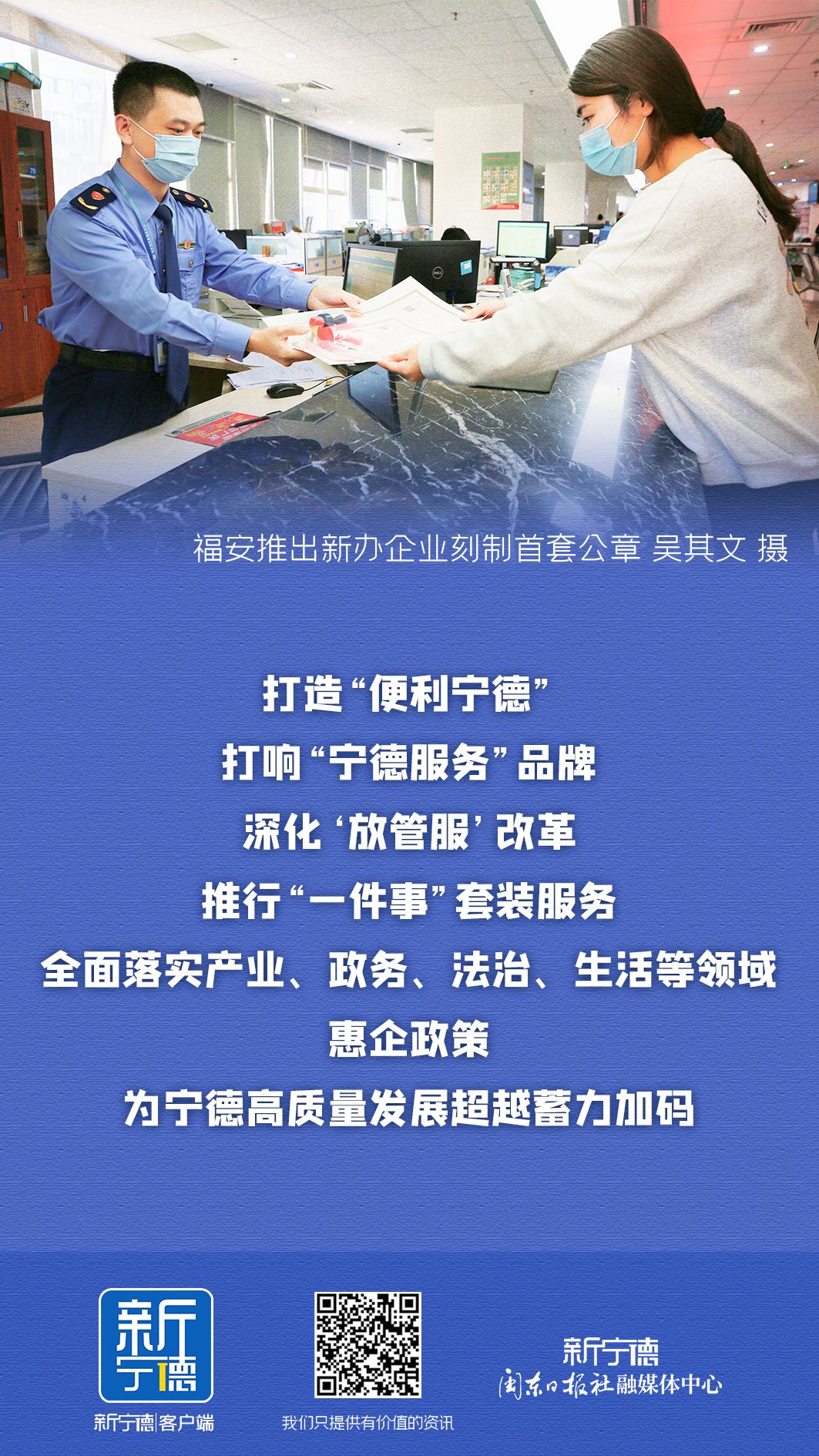 “我们将围绕打造‘便利宁德’、打响‘宁德服务’品牌,深化‘放管服’改革,推行‘一件事’套装服务,全面落实产业、政务、法治、生活等领域惠企政策,为高质量发展超越蓄力加码。”市发改委负责人表示。