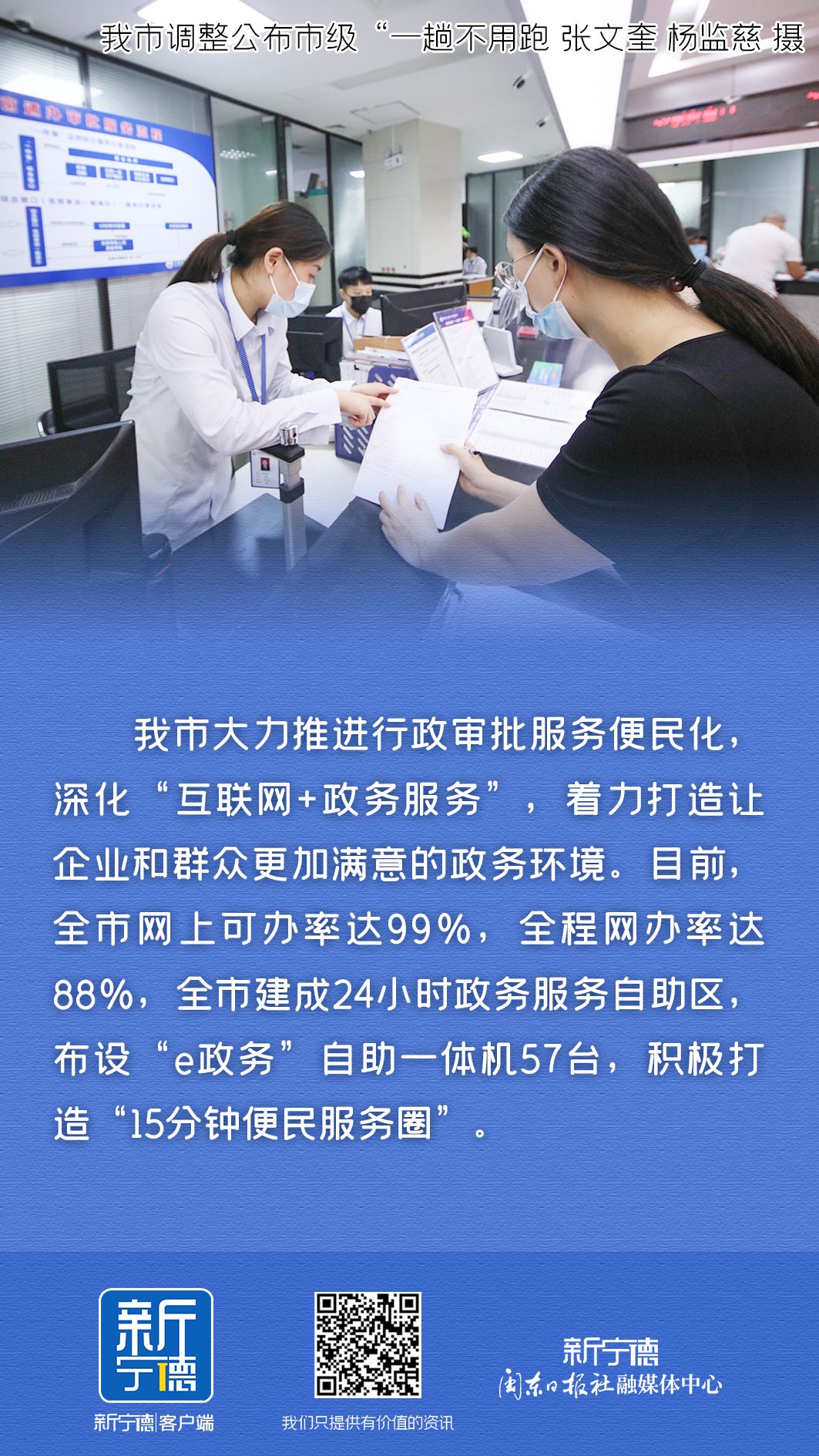 我市大力推进行政审批服务便民化,深化“互联网+政务服务”,着力打造让企业和群众更加满意的政务环境。目前,全市网上可办率达99%,全程网办率达88%,全市建成24小时政务服务自助区,布设“e政务”自助一体机57台,积极打造“15分钟便民服务圈”。