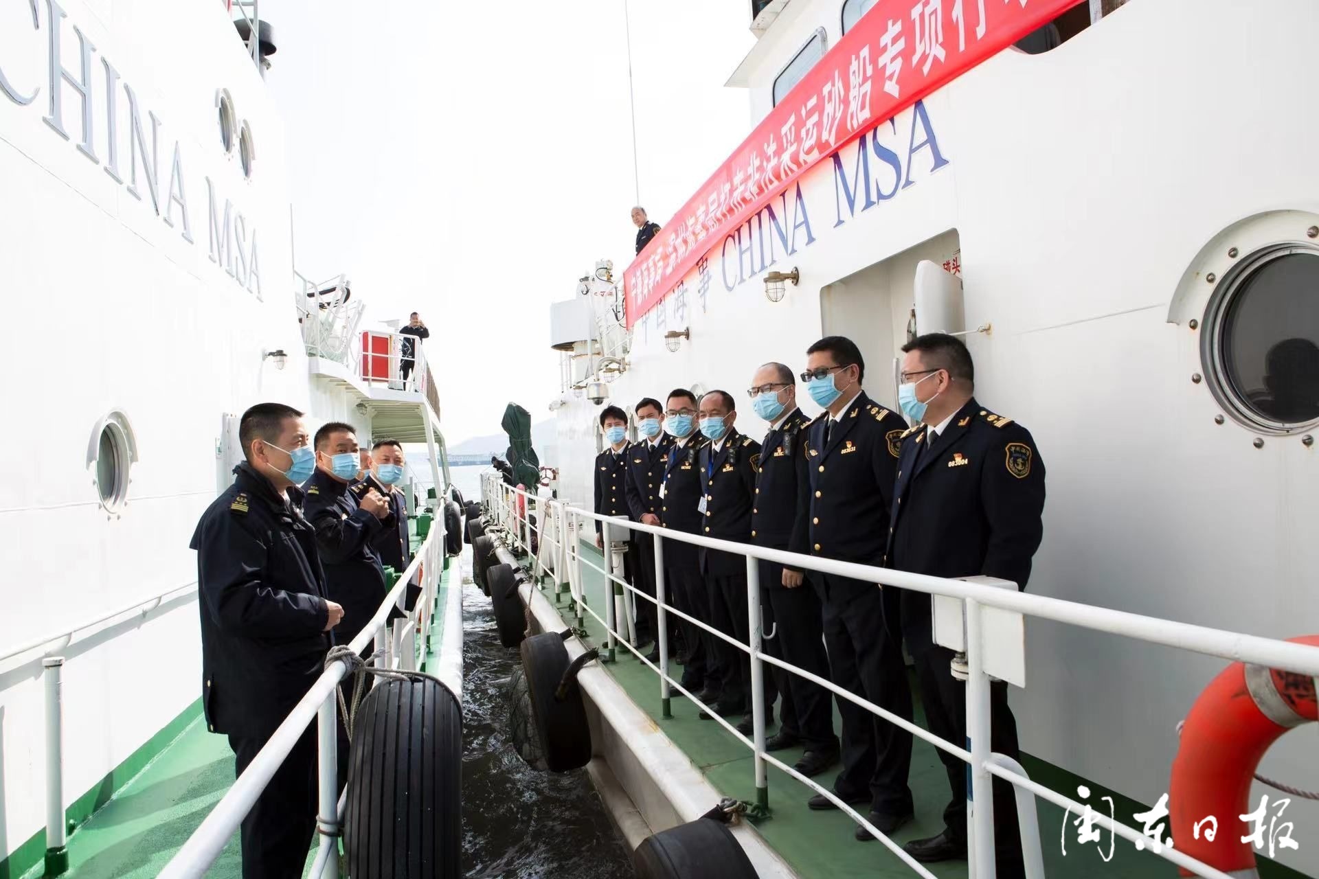 记者获悉,巡航首日,各部门间密切配合,出动海巡艇5艘次,联合执法人员50人次,历时8小时,共检查船舶16艘次,查获涉嫌违法砂船2艘次,并开展了“春节”节前安全宣传。