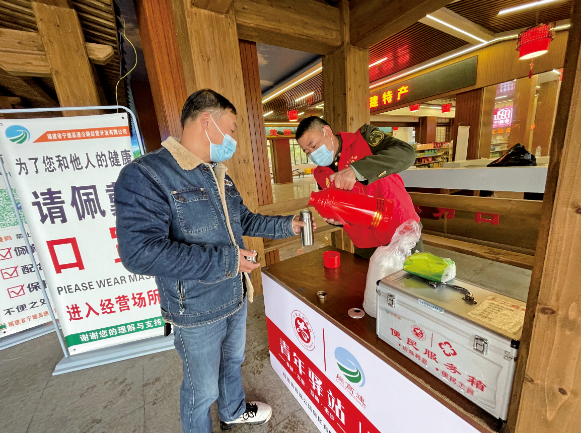 甬莞高速林厝服务区为往来旅客提供红糖生姜茶