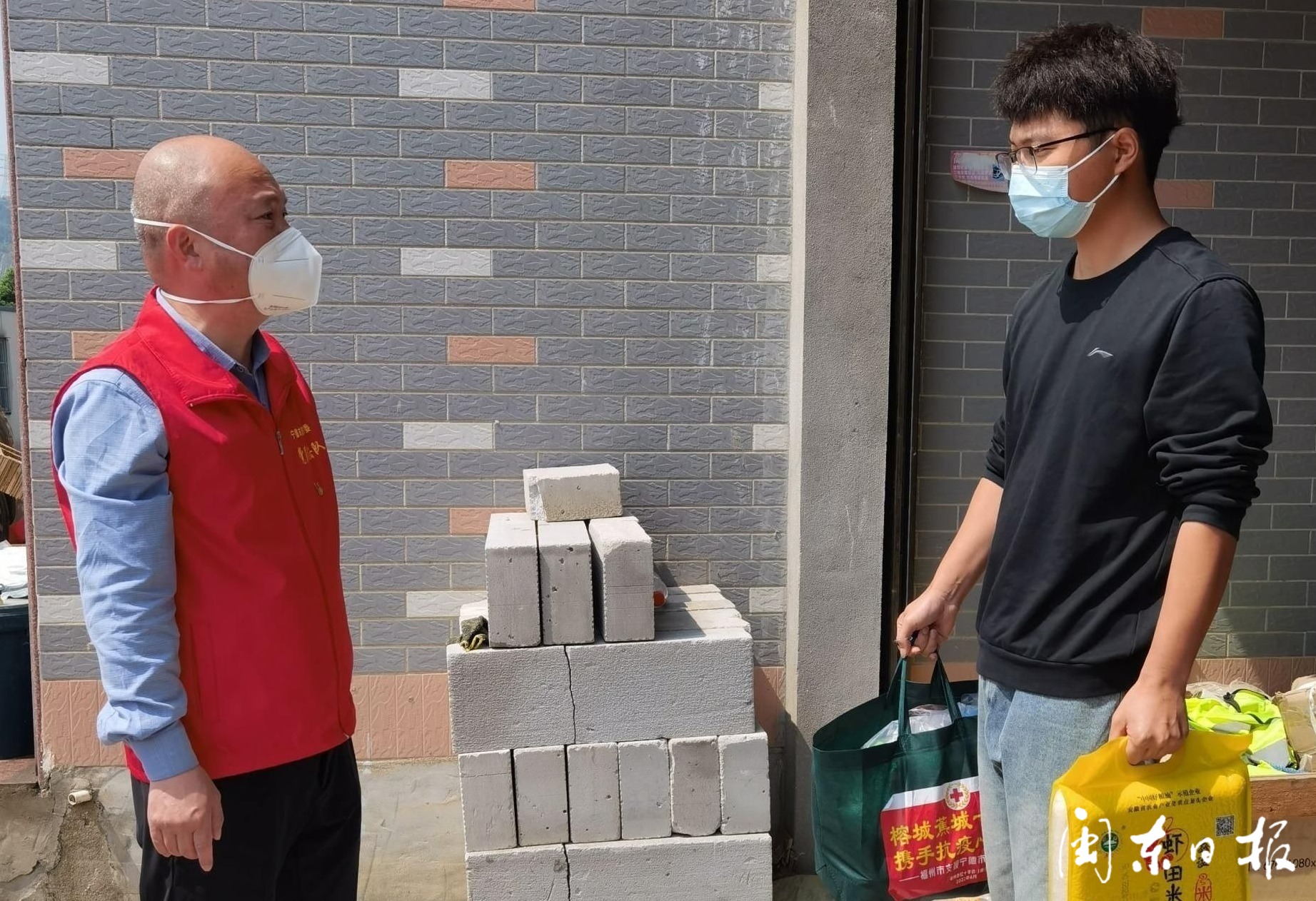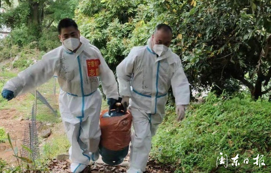 “大家注意啦,大米、油和蔬菜都送到了”“你要的液化气,放在门口了”……4月21日,在疫情封控区宁德市蕉城区七都镇河墘村书井里自然村,宁德市市场监督管理局志愿突击队的队员们,将各种生活物资放在各家各户门外,其中一位突击队员正拿着喇叭用畲语通知村民。不一会儿,村民们纷纷开门将物资取走。