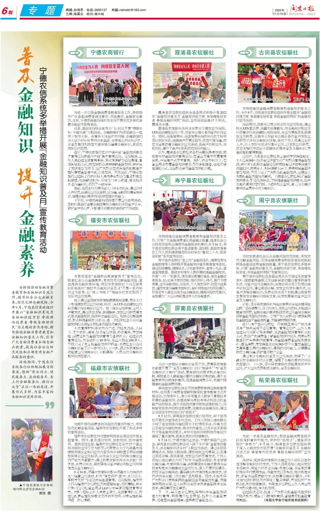 霞浦县农信联社组织全县各网点积极开展2022年“金融知识普及月 金融知识进万家 争做理性投资者 争做金融好网民”活动,宣传活动涵盖17个网点,覆盖各乡镇。