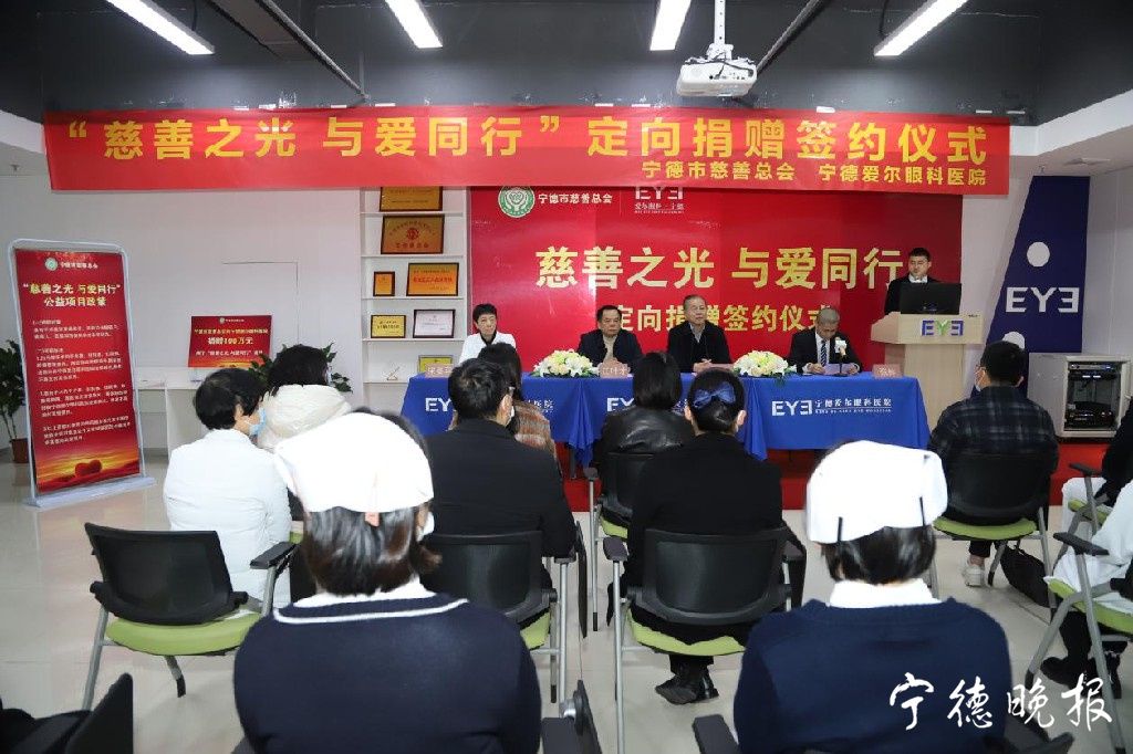 签约及捐赠仪式上,宁德市慈善总会向宁德爱尔眼科医院定向捐赠100万元公益金,主要将为患白内障等困难眼病对象提供帮助,恢复光明。
